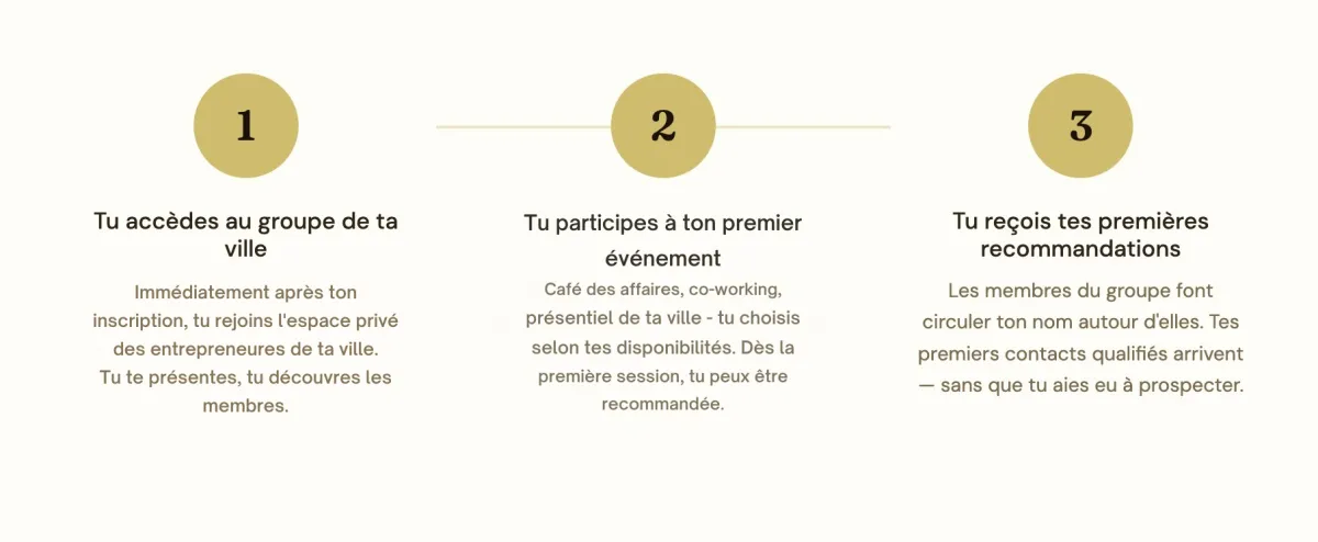Tout en bas de cette page nous avons la liste non exhaustive de nos présentiels (nous en ouvrons toutes les semaines), si votre ville ne s'y trouve pas, nous nous engageons à créer le votre en 10 jours à partir du moment où vous nous avez rejoint. Si votre ville s'y trouve, dès que vous adhérez vous avez accès aux entrepreneures de votre ville.